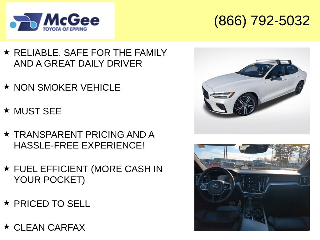 Recent Arrival! RELIABLE, SAFE FOR THE FAMILY AND A GREAT DAILY DRIVER, NON SMOKER VEHICLE, MUST SEE, TRANSPARENT PRICING AND A HASSLE-FREE EXPERIENCE!, FUEL EFFICIENT (MORE CASH IN YOUR POCKET), PRICED TO SELL, CLEAN CARFAX. At McGee Toyota Of Epping we want you to know that all our vehicles are priced at a competitive value position to the market. We use an independent 3rd party software to research internet listings on all vehicles in the market so we can ensure that our prices are the most competitive out there. We do this simply so people choose us when they start searching for their next car. Clean CARFAX. 2021 Volvo S60 T6 R-Design 4D Sedan Crystal White AWD Automatic with Geartronic I4 McGee Toyota is a Family-Owned Business and we enjoy assisting all of our guests buying their next vehicle!